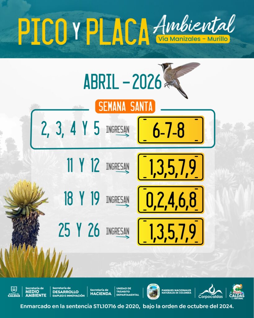 La Gobernación de Caldas informó que durante el mes de abril se mantendrá la medida de pico y placa ambiental en la vía Manizales–Murillo, en cumplimiento de la Sentencia STL10716 de 2020, como una acción clave para la protección del Parque Nacional Natural Los Nevados y sus zonas de influencia.