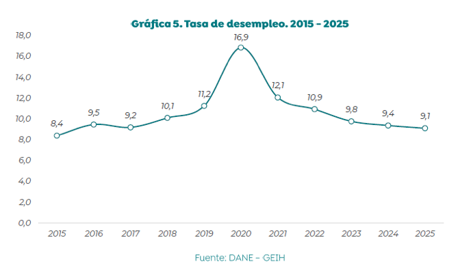 En materia de desempleo, el boletín también confirma una tendencia positiva, luego del pico registrado en 2020 (16,9%), el indicador mantiene una reducción sostenida hasta ubicarse en 9,1% en 2025, nivel cercano al comportamiento previo a la pandemia.