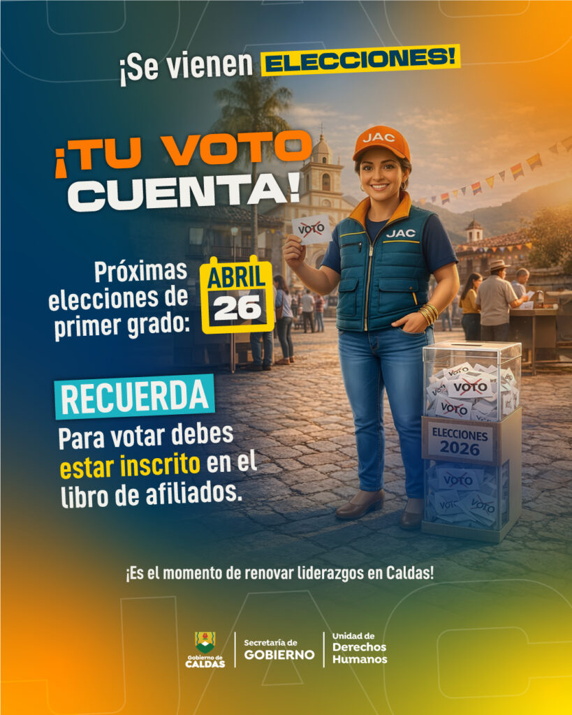 La Gobernación de Caldas, a través de la Secretaría de Gobierno y su Unidad de Derechos Humanos, anuncia la próxima jornada de elecciones de las Juntas de Acción Comunal (JAC), que se llevará a cabo el domingo 26 de abril.