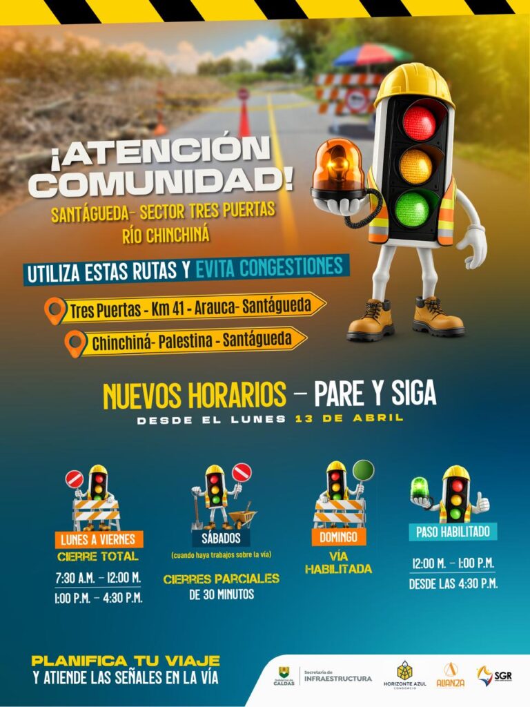 “Sabemos que estas medidas pueden generar incomodidades, especialmente en sectores como Santagueda, por eso queremos reiterar el llamado a utilizar las vías alternas habilitadas y a planificar los desplazamientos con anticipación. Las vías conectan vidas, y estos trabajos son clave para avanzar hacia un Caldas más seguro y mejor comunicado”, indicó el secretario de Infraestructura, Jorge Ricardo Gutiérrez Cardona.