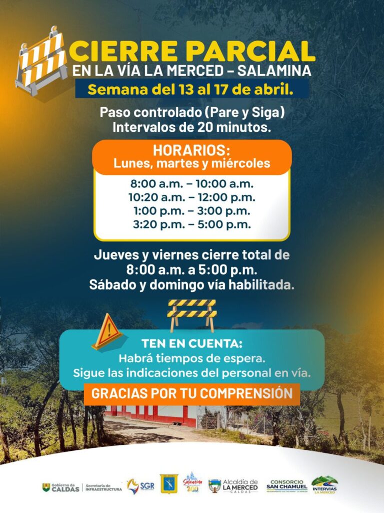 Otro de los sectores con cierres es la vía Salamina – La Merced, donde se implementa paso controlado en los siguientes horarios: