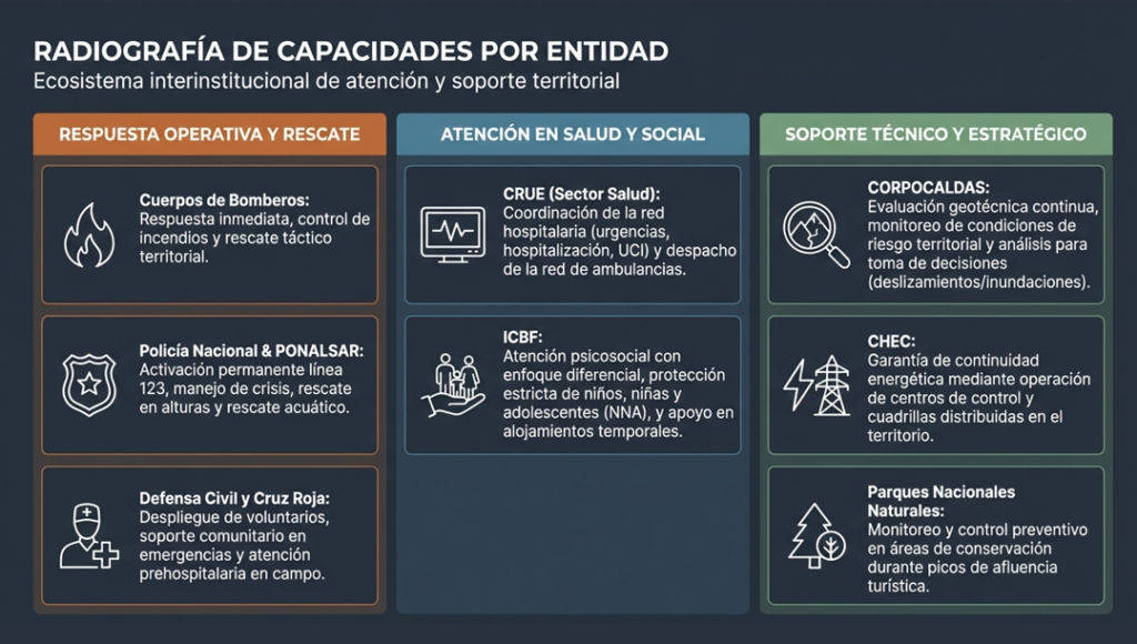 Por su parte, Óscar Mario Ramírez Villegas, director seccional de la Defensa Civil Colombiana en Caldas, destacó que los organismos de socorro han sido convocados para reforzar la preparación durante esta temporada. “Ponemos a disposición todos nuestros grupos de respuesta en articulación con el sistema departamental, con el objetivo de aumentar la seguridad de la comunidad y de los visitantes”, indicó.