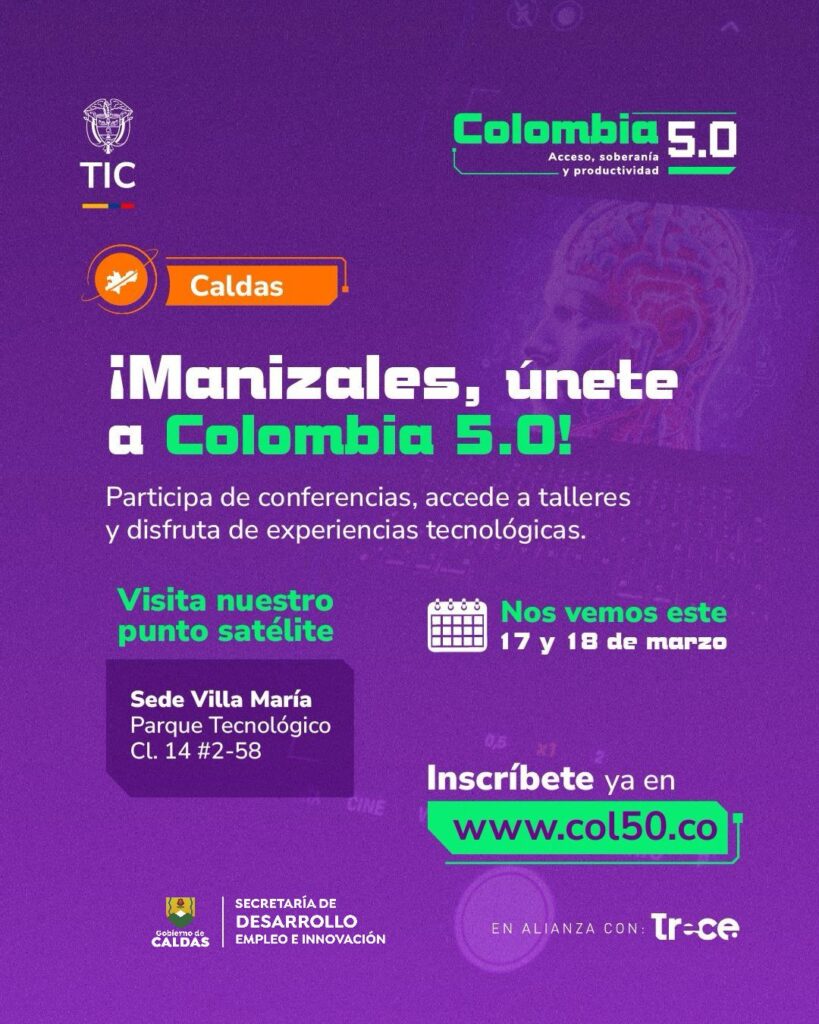 Manizales y Villamaría serán el punto de partida de Colombia 5.0, la nueva apuesta del Gobierno nacional para fortalecer los ecosistemas digitales y promover la innovación tecnológica en el país. El evento, liderado por el Ministerio de Tecnologías de la Información y las Comunicaciones (MinTIC), iniciará su ruta nacional los próximos 17 y 18 de marzo, con actividades en la Universidad de Caldas y en el Parque Tecnológico Futura.