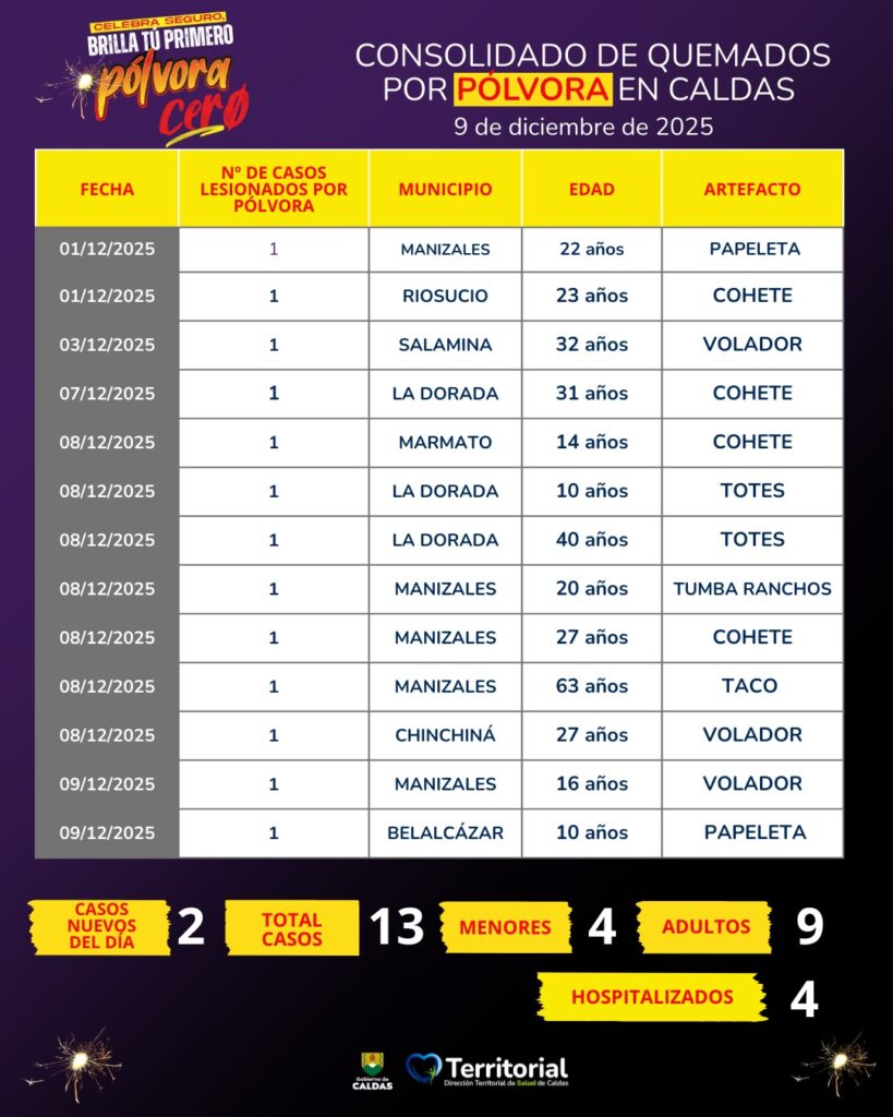 La Dirección Territorial de Salud de Caldas (DTSC) informó sobre el aumento en los casos de quemados por pólvora durante las celebraciones de velitas, correspondientes al 7 y 8 de diciembre. Según el reporte de vigilancia intensificada, con corte al 9 de diciembre, el departamento registra 13 personas lesionadas, lo que representa un incremento del […]