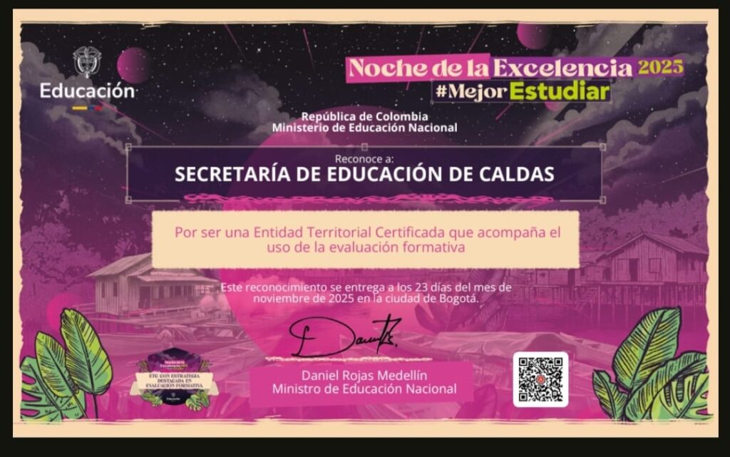 En un evento denominado la Noche de la Excelencia 2025, donde el Ministerio de Educación y el Gobierno Nacional destacaron los maestras, maestros, estudiantes y líderes educativos que, desde cada territorio, están transformando la educación con creatividad, corazón y compromiso, el MEN reconoció a la Secretaría de Educación de Caldas por su estrategia “Juntos por el Saber”.