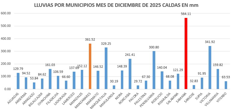 A nivel municipal, los mayores registros se presentaron en Samaná (564,11 mm) y Manzanares (361,52 mm).