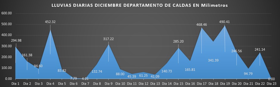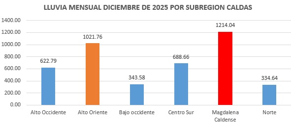 De acuerdo con los reportes de la Red de Estaciones Meteorológicas del departamento, durante el mes de diciembre se registraron picos significativos de lluvias los días 4, 17 y 19, con acumulados de 452,32; 468,46 y 490,41 milímetros respectivamente. Las subregiones más afectadas han sido el Magdalena Caldense, con 1.214,04 mm, y el Alto Oriente, con 1.021,76 mm.