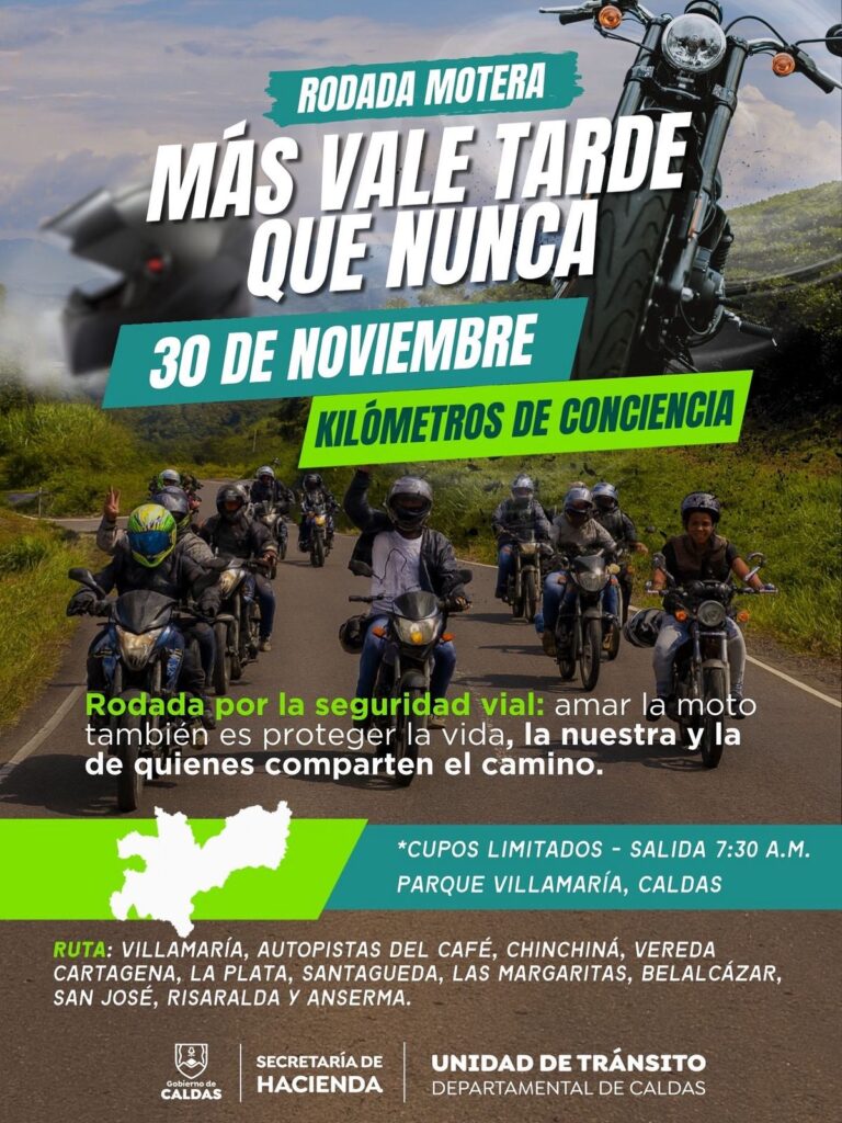La Gobernación de Caldas, a través de la Unidad de Tránsito de la Secretaría de Hacienda, lanza la campaña ‘Más vale tarde que nunca’, una estrategia que busca reducir los siniestros viales en motocicleta durante la temporada decembrina. La iniciativa inicia con una gran rodada motera que se desarrollará este 30 de noviembre, y mediante la cual se promoverá la cultura de autocuidado, el uso adecuado de la motocicleta y el respeto por las normas de tránsito.