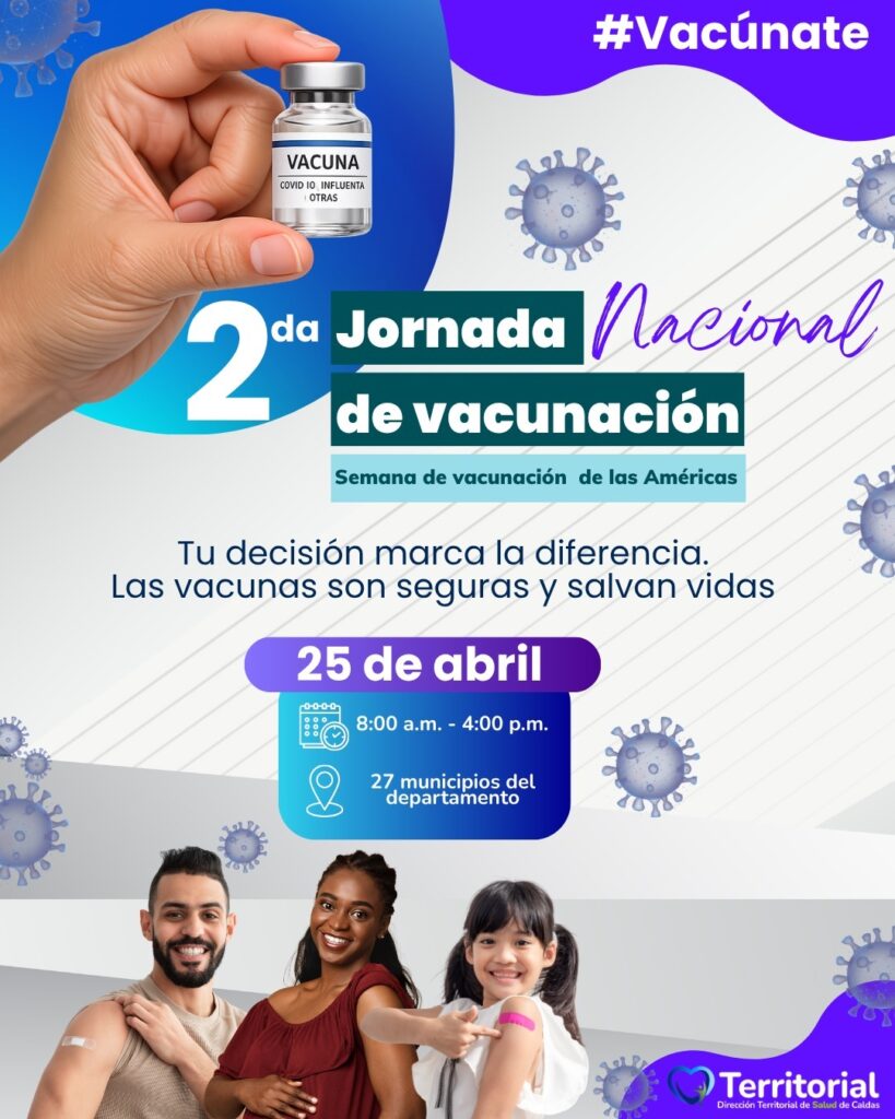 En este contexto, la DTSC extendió una invitación especial a la comunidad caldense para participar en la Gran Jornada de Vacunación de las Américas, que se realizará el sábado 25 de abril, en todos los municipios del departamento. Durante esta jornada se contará con biológicos para menores de 6 años, mujeres gestantes y adultos mayores, incluyendo la vacuna contra la influenza.